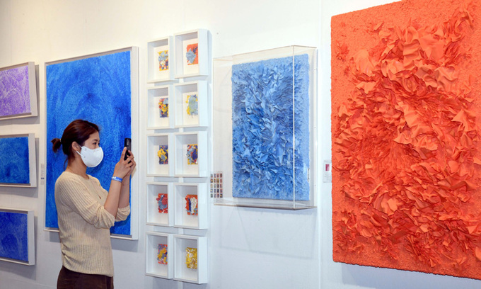 16일 서울 강남구 코엑스에서 ‘조형아트서울 2021’이 개막한 가운데 한 관람객이 전시작품을 촬영하고 있다. 19일까지 계속되는 6회 조형아트서울에는 권치규·김성복 등 국내외 작가 700여명의 조각과 설치미술, 회화 작품 2500여점이 전시된다.