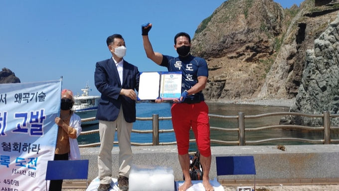 조승환 씨는 “일본 시마네현 억지 독도의날 기념행사와 교과서 왜곡 기술 검정 통과 발표, 독도 역사 왜곡 의무화교육 등 도를 넘은 망언과 억지 주장자들에게 경종을 울리고자 퍼포먼스를 펼쳤다”며 “이번 도전을 통해 한국인의 기개와 의지를 일본에 전하고 독도는 대한민국 고유의 영토라는 사실을 재천명하고자 한다”고 강조했다.