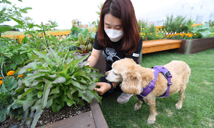 10일 전북 완주군 이서면 농촌진흥청 국립원예특작과학원 도시농업공원 모델 조성지에 마련된 ‘반려동물 동반 텃밭’에서 한 직원이 개와 함께 채소를 살펴보고 있다.