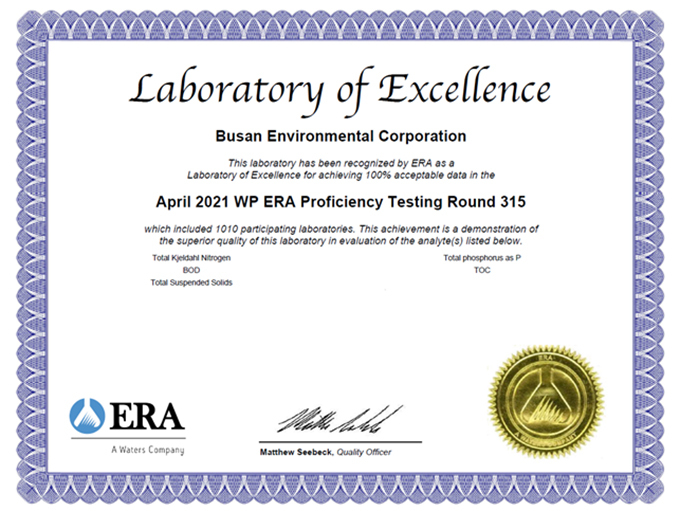부산환경공단은 최근 미국 ERA가 주관하는 ‘국제숙련도 시험’ 수질 분야에서 우수기관으로 선정됐다고 11일 밝혔다.