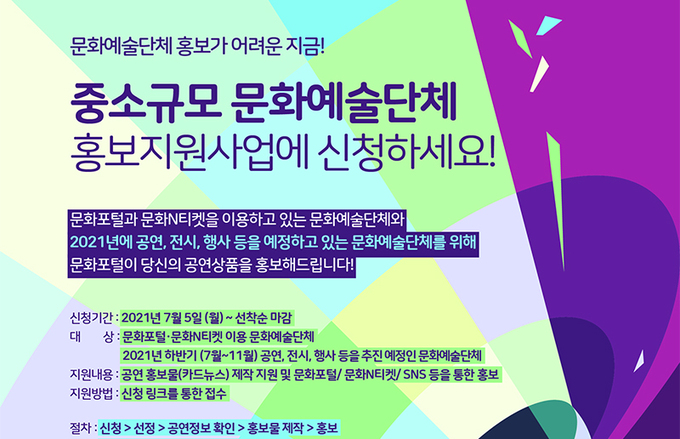 ‘중소규모 문화예술단체 홍보지원’ 사업은 홍보 콘텐츠 제작이 어려운 중소규모 문화예술단체가 적극적인 공연 홍보를 진행할 수 있도록 온라인 공연홍보물인 카드뉴스를 무료로 제작하여 문화포털과 사회관계망서비스(SNS)를 통해 콘텐츠홍보, 언론보도 등을 지원하는 사업이다.