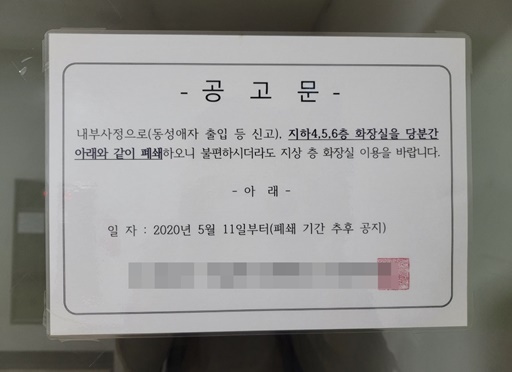 서울 종로구의 한 빌딩에 붙은 공고문이다. 이 빌딩의 4~6층 화장실에서 일어나는 일로 “동성애자 출입 등 신고 때문에 폐쇄한다”는 경고문이 붙었고, 성소수자 차별 논란이 일었다.