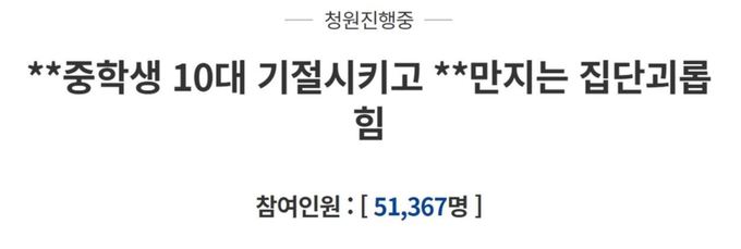 지난 14일 청와대 국민청원 게시판에는 '중학생 10대 기절시키고 XX 만지는 집단 괴롭힘'이라는 제목의 청원 글이 올라왔다.