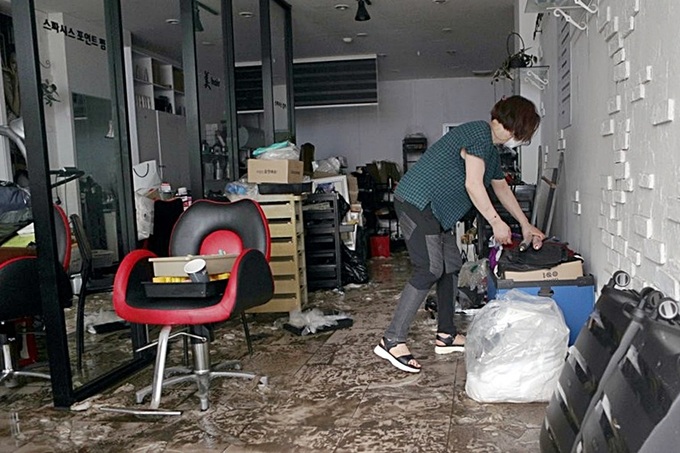 지난 6일 집중호우로 침수 피해가 발생한 전북 익산시 중앙동 중앙시장 내 한 미용실 주인이 물에 젖은 집기류를 정리하고 있다. 연합뉴스