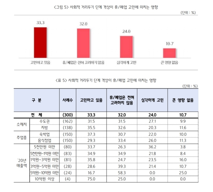 조사 결과 전체 응답자 57.3%는 거리두기 단계 격상으로 인해 휴·폐업을 고민하고 있다고 답했다. 구체적으로 수도권 소재 소상공인 58.5%, 지방 55.8%가 휴·폐업을 고민하고 있다고 응답했다.