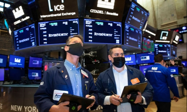 미국 뉴욕증권거래소(NYSE) 입회장에서 트레이더들이 업무를 처리하고 있다. 뉴욕=AP연합뉴스