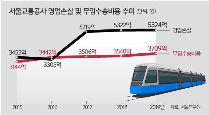덩달아 서울지하철 영업손실 폭도 커지고 있다. 서울교통공사 재무 현황을 보면 연간 3600억원 수준이던 영업손실은 2017년 5219억원으로 급증한 뒤 2019년 5324억원을 기록했다. 이 중 무임수송비용은 3709억원가량으로 전체 영업손실의 70%를 차지했다. 설상가상으로 코로나19 이후 전반적인 지하철 이용이 줄면서 지난해 기준 서울교통공사 적자는 1조원을 넘어섰다.