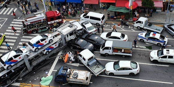 경찰에 따르면 승용차 6대를 실은 탁송차량은 내리막길에서 우회전하던 중 횡단보도를 넘어 건너편에 있던 차량 10대를 잇달아 들이받은 뒤 겨우 멈춰 섰다.