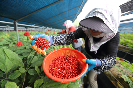 20일 충북 음성군 농촌진흥청 국립원예특작과학원 인삼특작부 시험 재배지에서 연구원들이 빨갛게 맺힌 인삼 열매를 수확하고 있다. 인삼 열매의 과육 부분은 화장품과 건강보조식품 용도로 쓰고, 씨앗은 종자로 사용한다.