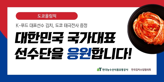 한국농수산식품유통공사(aT, 사장 김춘진)는 도쿄올림픽에 참가하는 한국선수단의 선전을 응원하기 위해 21일부터 선수단에 국산 김치를 제공한다.