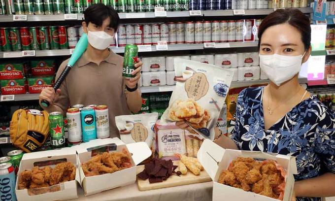 21일 서울 이마트 성수점에서 모델들이 도쿄올림픽 개막을 앞두고 집에서 즐길 수 있는 응원 먹거리를 소개하고 있다. 이마트는 22일부터 28일까지 다양한 먹거리와 안주 등을 할인 판매하는 ‘홈관중 응원 먹거리’ 행사를 진행한다.