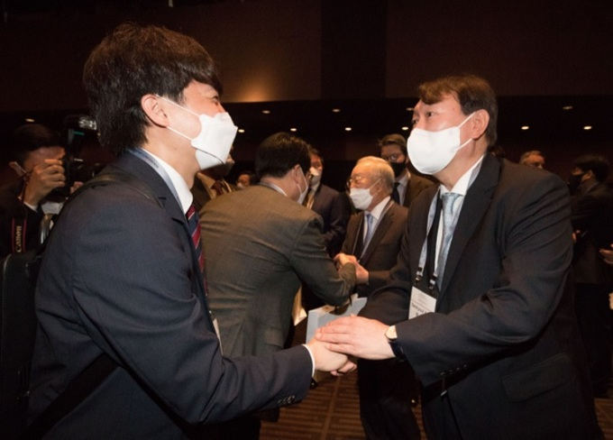 이준석 국민의힘 대표(왼쪽)와 윤석열 검찰총장이 문재인 정권 교체를 다짐하며 반갑게 악수를 나누고 있다. 세계일보 자료사진
