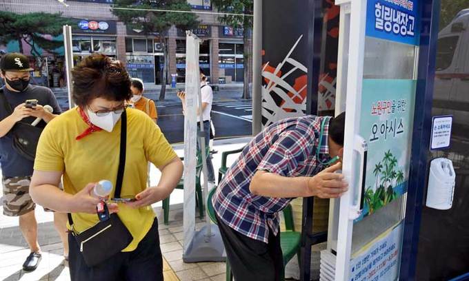 폭염이 기승을 부린 21일 서울 노원구 한 임시선별검사소에서 코로나19 진단검사를 받기 위해 대기 중이던 시민들이 구청에서 마련한 ‘힐링 냉장고’에서 생수를 꺼내고 있다.