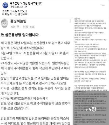 24일 페이스북 페이지 ‘육군훈련소 대신 전해드립니다’는 육군 22사단 소속 의무병 심준용 상병(순직 후 일병서 상병으로 추서)의 어머니 편지를 공개했다.
