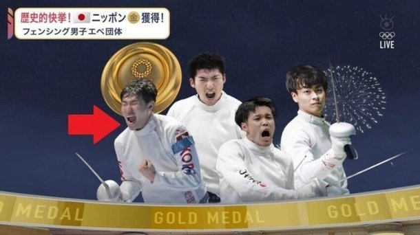 후지TV는 이날 2020도쿄올림픽 펜싱 에페 남자 단체전에서 자국 대표팀이 금메달을 딴 소식을 전하며 4명의 선수 사진을 배경으로 사용했다. 그러나 해당 사진 속 4명 중 1명은 일본 선수가 아닌 한국의 박상영 선수였다. 그가 입은 유니폼에도 ‘KOREA’라는 글자가 적혀있다.