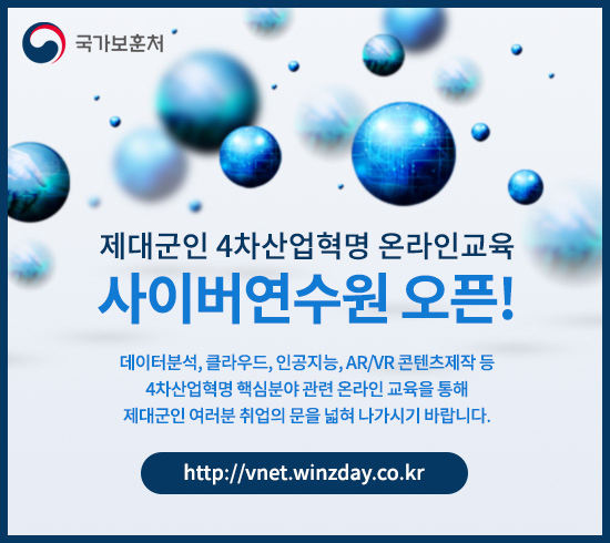 국가보훈처는 4차 산업혁명 시대에 맞춰 중장기 제대군인의 취업역량을 높이기 위해 ‘제대군인 4차 산업혁명 사이버연수원’을 이달부터 개설해 운영한다고 1일 밝혔다.