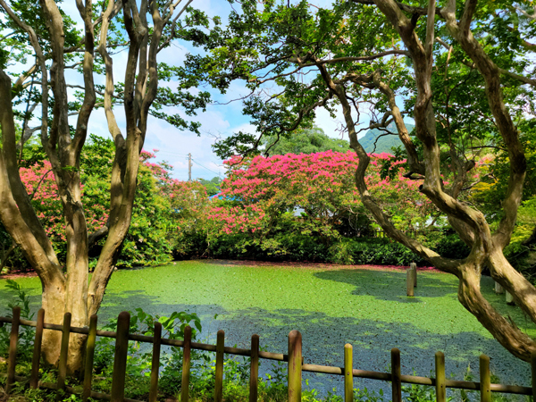 고즈넉한 힐링 즐기는 장흥여행/고영완 고택앞 200여년전 만든 연못 송백정에 자홍색 배롱나무 꽃 활짝/바람불어 자홍 꽃 날리니 연못도 자홍으로 물들어/천년고찰 보림사 비자림숲·정남진 편백나무숲 마음에 ‘쉼표’ 찍다