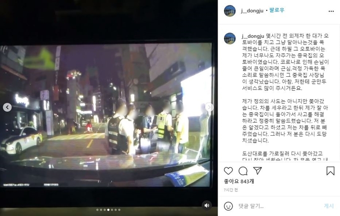 장동주는 14일 개인 사회관계망서비스(SNS)에 “몇 시간 전 외제 차 한 대가 오토바이를 치고 그냥 달아나는 것을 목격했다”고 말문을 열었다.