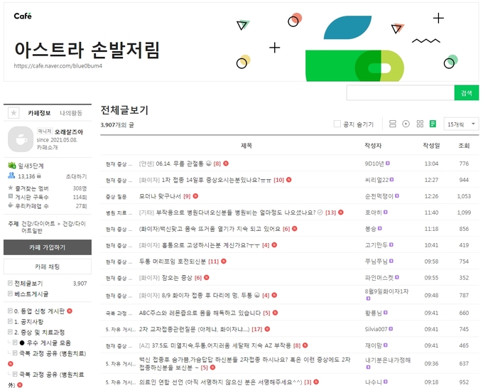 이 카페에는 17일 현재 가입자가 1만3136명이고, 게시글은 3907개에 달한다. 그만큼 많은 사람들이 코로나19 백신 접종 후기나 접종 후 증상 공유, 치료에 대한 이야기를 나누고, 병원이나 당국의 대처를 공유하고 있다는 것이다.