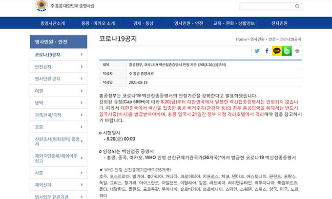 주홍콩 한국 총영사관은 19일 인터넷 홈페이지를 통해 “홍콩 정부는 코로나19백신 접종 증명서의 인정 기준을 강화한다고 발표했다”며 “강화된 규정에 따라 20일부터 대한민국에서 발행한 백신 접종 증명서는 인정되지 않는다”고 밝혔다.