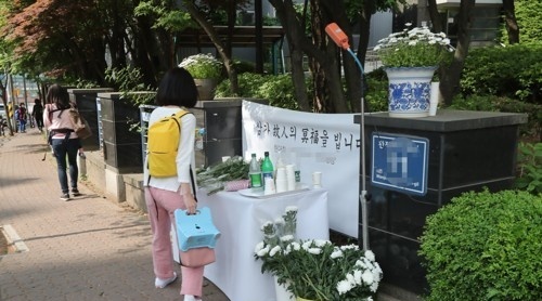 지난 5월13일 오전 인천시 서구 마전동의 한 아파트단지 앞에 4세 딸의 손을 잡고 횡단보도를 건너다가 차량에 치여 숨진 A(32·여)씨를 추모하는 공간이 마련돼 있다. 연합뉴스