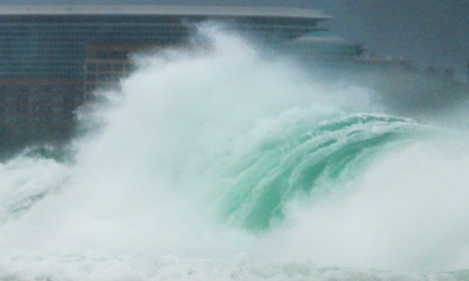 북상 중인 제14호 태풍 ‘찬투’의 간접영향으로 제주도 육상 전역에 강풍·호우주의보가 발효된 13일 제주 서귀포시 예례동 인근 앞바다에 큰 파도가 몰아치고 있다. 이날 한라산 진달래밭 등 제주 일부지역에는 100㎜가 넘는 많은 비가 내리고 순간풍속 초속 20 이상의 강한 바람이 불어 제주공항 항공편 8편이 결항했다. 기상청은 14일 제주지역에 시간당 50∼70㎜의 매우 강한 비가 내리는 등 15일까지 최대 500㎜의 매우 많은 비가 내릴 수 있다고 예보했다.