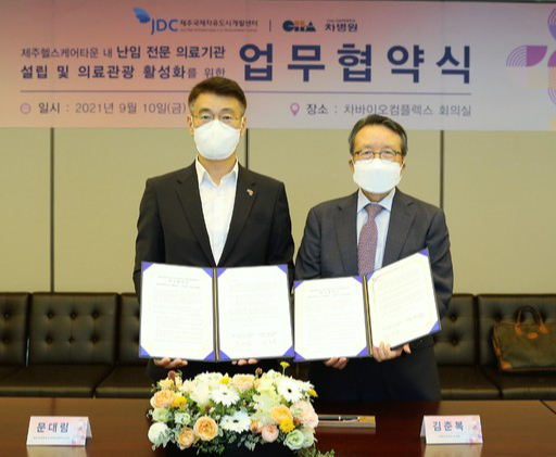 JDC는 지난 10일 차병원·바이오 그룹 본사인 차바이오컴플렉스에서 문대림 JDC 이사장, 차광렬 차글로벌연구소장, 김춘복 성광의료재단 이사장, 윤도흠 의료원장 등이 참석한 가운데 차병원·바이오 그룹과 헬스케어타운 내 난임 전문의료기관 설립을 위한 업무협약을 체결했다.