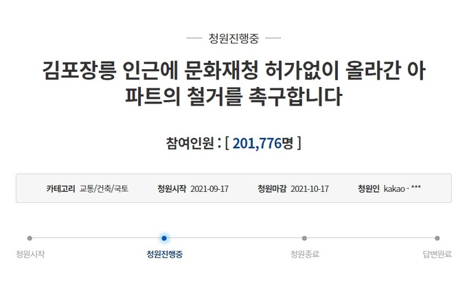 앞서 지난달 17일 청와대 국민청원에 올라온 ‘김포 장릉 인근에 문화재청 허가 없이 올라간 아파트의 철거를 촉구합니다’라는 글에 6일 오후 5시 기준으로 20만1776명이 서명했다.