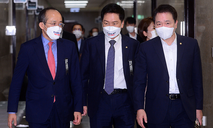 국민의힘 김기현 원내대표 등 국민의힘 의원 4명은 7일 대장동 사건 관련해 서울 서대문구 경찰청 국가수사본부를 항의 방문했다.