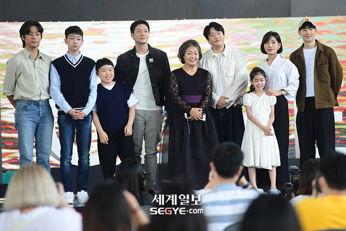 배우 박정민, 강지석, 김담호, 손석구, 변중희, 박정민, 박소이, 최희서, 이제훈(사진 왼쪽부터)이 8일 오후 부산광역시 우동 영화의 전당에서 열린 영화 '언프레임드'의 무대인사에 참석해 포즈를 취하고 있다.