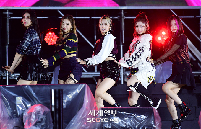 걸그룹 있지가 10일 오후 서울 삼성동 코엑스에서 열린 온택트 2021 영동대로 K-POP 콘서트 '희망으로의 한걸음'에 참석해 열띤 공연을 펼치고 있다.