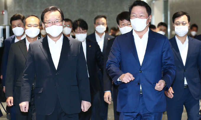 협약에 KT(1만2000개), 삼성그룹(3만개), LG그룹(3만9000개)에 이어 네 번째로 SK가 참여하면서 청년희망ON 프로젝트를 통해 향후 3년간 대기업이 약속한 일자리가 10만개를 돌파했다. 김 총리는 조만간 정의선 현대차그룹 회장과도 만날 예정이다.