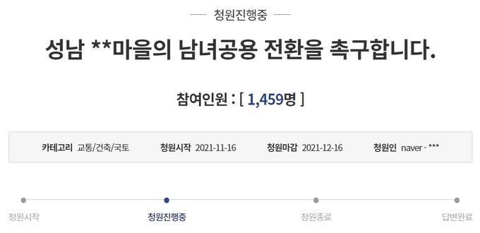 22일 청와대 국민청원 게시판에는 ‘여성전용 임대아파트 성남 **마을의 남녀공용 전환을 촉구합니다’라는 제목의 글에 대한 청원이 진행 중이다.