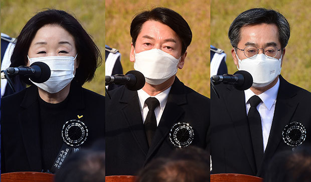 정의당 심상정(왼쪽부터), 국민의당 안철수, 새로운물결(가칭) 김동연 대선 후보가 22일 서울 동작구 국립서울현충원 내 김영삼 전 대통령 묘역에서 열린 6주기 추모식에서 추모 발언을 있다. 국회사진기자단