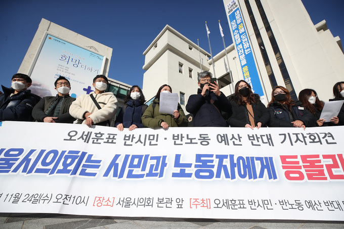 민간위탁노동자공동대책위원회가 24일 오전 서울 중구 서울시의회 본관 앞에서 '오세훈표 반시민·반노동 예산 반대 기자회견'을 개최하고 있다. 연합뉴스