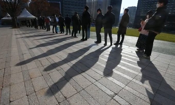 코로나19 신규 확진자가 4,116명으로 집계된 24일 서울광장에 설치된 임시선별진료소에서 시민들이 검사를 받기 위해 대기하고 있다.