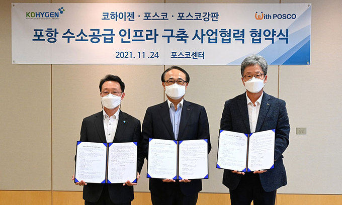 포스코에 따르면 포스코는 이날 서울 포스코센터에서 유병옥 포스코 산업가스·수소사업부장, 윤양수 포스코강판 대표이사, 이경실 코하이젠 대표이사 등이 참석한 가운데 ‘포항 수소 공급 인프라 구축 사업 협력에 관한 업무협약’을 체결했다.