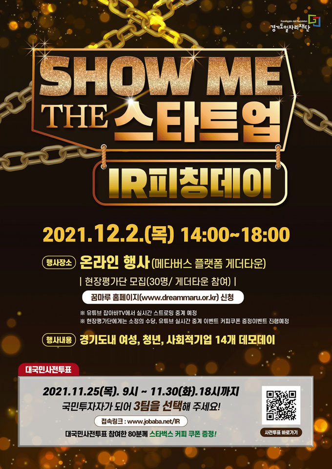발표 전까지 각 기업은 투자유치를 위한 스토리라인 구성과 발표 역량을 키울 수 있도록 일대일 맞춤형 컨설팅을 받는다. 투자유치를 위한 기업별 발표회는 다음달 2일 온라인 공간인 게더타운에서 열린다. 앞서 대국민 사전투표는 일자리 플랫폼인 ‘잡아바’에서 25일 개막했다.