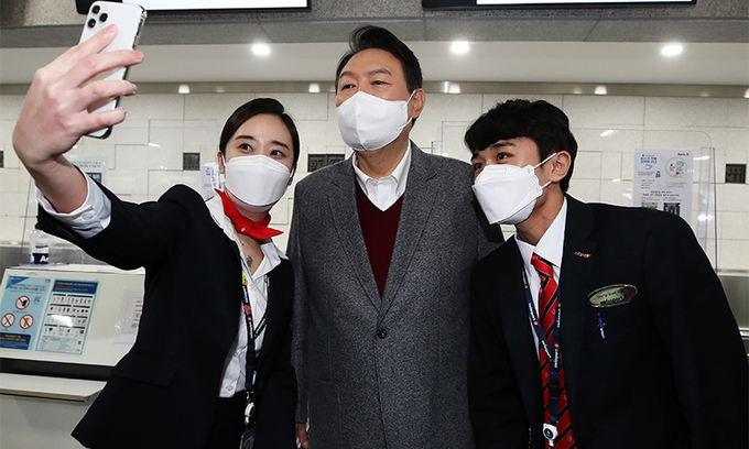 방문을 마친 뒤 기자들과 만난 윤 후보는 국민의힘 이준석 대표가 이날 돌연 일정을 모두 취소하고 잠적하는 등 최근 선거대책위원회를 둘러싼 잡음이 끊이지 않는 데 대해 “저는 후보로서 역할을 다하는 것뿐”이라고 답했다. 그는 선대위 일정이나 인선에서 ‘이 대표 패싱’ 논란이 이는 원인이 뭐라고 생각하느냔 물음엔 “저도 잘 모르겠다”고만 했다. 자신의 공약인 ‘소상공인 50조원 지원’에 더불어민주당 이재명 후보가 호응해 당장 논의하자고 한 것과 관련해선 “엊그제까진 포퓰리즘이라고 공격하다가 표 계산을 해보니 그러면 안 되겠다는 생각이 든 모양”이라며 “어찌 됐든 선거와 관계없이 절벽에 떨어진 소상공인·자영업자에 대한 긴급 구조는 반드시 필요하다”고 역설했다.