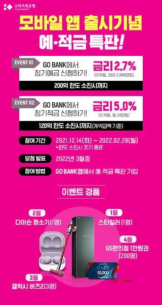 고려저축은행은 앱 출시를 기념해 특판 예·적금 판매를 진행한다. 모바일로만 가입 가능한 ‘고 뱅크 정기예금’은 12개월 연 2.7%의 금리 상품으로, 10만원부터 최대 2000만원까지 가입할 수 있다.