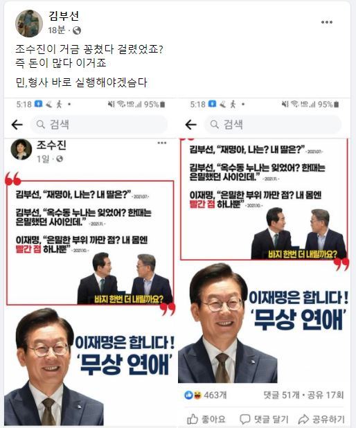 조 최고위원이 올린 게시물에는 이재명 민주당 대선 후보의 사진과 함께 김부선과 관련된 과거 스캔들과 관련한 내용이 담겨 있다. 사진 속에는 ‘이재명은 합니다! 무상연애’라고 적혀있다.
