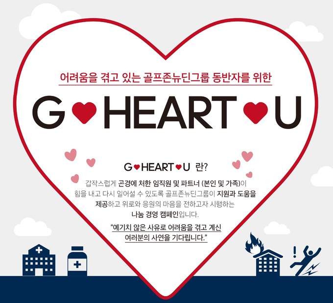 골프존뉴딘그룹은 2일 그룹사와 동반 성장하고 있는 협력사 및 임직원을 지원하는 위기지원 프로그램 'G-HEART-U'를 진행했다고 밝혔다.