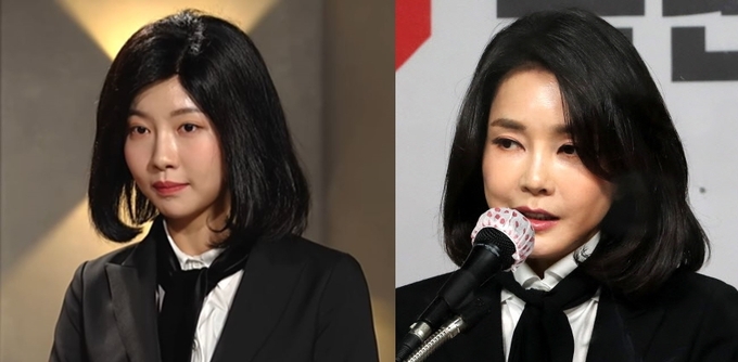 앞서 김씨의 트레이드 마크인 ‘애교머리’ 헤어스타일을 선보인 바 있는 주현영은 이날 중반달머리로 변신한 것은 물론 지난달 26일 김씨가 기자회견에서 허위이력 의혹을 사과했을 때 복장을 패러디해 웃음을 안겼다.