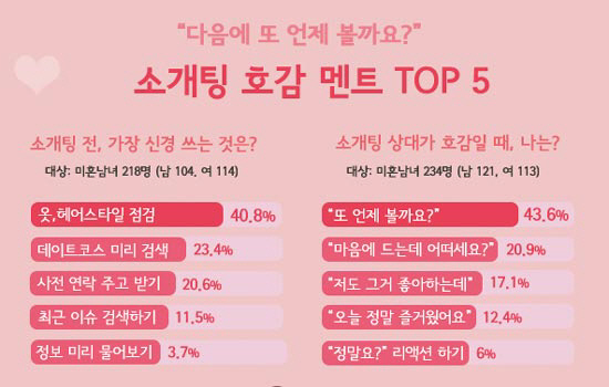 또한 ‘소개팅 전, 가장 신경 쓰는 것’이라는 설문에는 미혼남녀 218명(남 104, 여 114) 모두 ‘옷과 헤어스타일 점검(40.8%)’을 1순위로 꼽았다. 2순위는 ‘데이트코스 미리 검색(23.4%)’이었다.