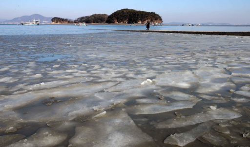 내륙 일부지역에 한파특보가 발효되는 등 강추위가 기승을 부린 13일 인천 영종도 예단포 해변 바닷물이 얼어 붙어 있다.