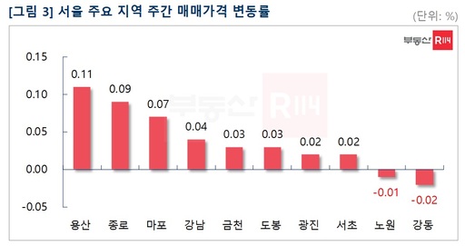 지역별로는 용산(0.11%), 종로(0.09%), 마포(0.07%), 강남(0.04%), 금천(0.03%), 도봉(0.03%), 광진(0.02%), 서초(0.02%) 등이 올랐다. 반면 강동(-0.02%)과 노원(-0.01%)은 대단지 아파트값이 하향 조정되면서 떨어졌다.