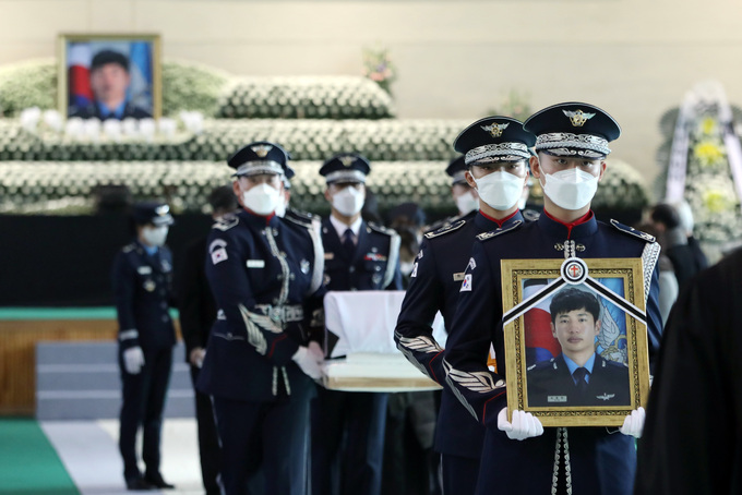 “참된 군인정신, 잊지 않겠습니다”… ‘전투기 추락’ 故 심정민 소령 영결식 공군 F-5E 전투기 추락사고로 순직한 고(故) 심정민 소령(29·공사 64기·추서 계급)의 영결식이 14일 경기 수원시 제10전투비행단에서 열렸다. 영결식은 고인의 유족과 동기생, 동료 조종사 및 부대장병이 참석한 가운데 부대장(部隊葬)으로 엄수됐다. 수원=연합뉴스
