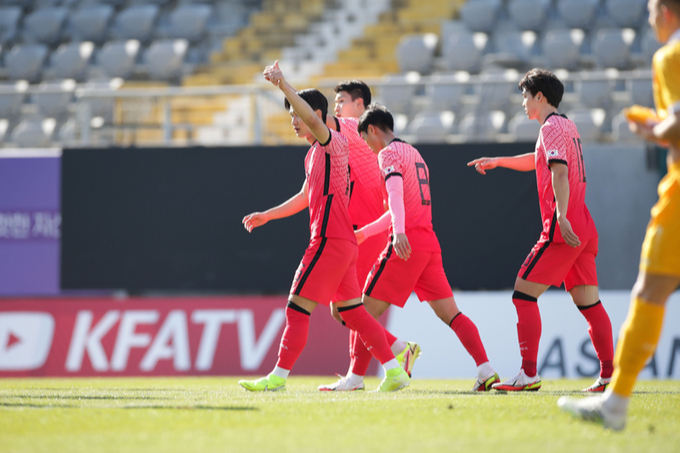 이런 공세 속에 전반 20분 첫 골이 나왔다. 송민규의 패스를 받은 권창훈이 페널티지역 안 오른쪽으로 빠져들어 가 올린 크로스가 골키퍼 손을 스쳐 뒤로 흐르자 골 지역 왼쪽에 있던 김진규가 오른발로 밀어 넣었다. 여기에 전반 33분 백승호가 프리킥 상황에서 호쾌한 중거리 슈팅으로 또 한 골을 만들어냈다.