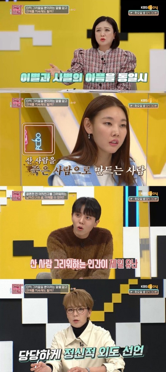 모든 이야기를 들은 김숙은 “어떻게 집안의 반대로 헤어진 연인과 사고로 죽은 연인을 동일시할 수가 있냐. 그러면서 계속 ‘너도 전 연인을 그리워하잖아’라고 말끝마다 하면서 강요하고 있다. 둘의 관계를 회복한다고 해도 이 얘기는 계속할 거다”라고 충고했다.