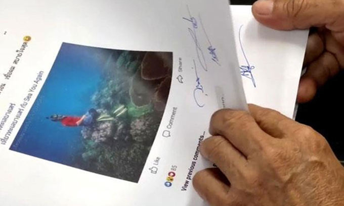 해양연안자원국에 따르면 이 태국인 남성은 촌부리주 사타힙 지역에 있는 크람 노이섬 수중 산호초 위에 앉아 있는 사진을 페이스북에 올렸다.